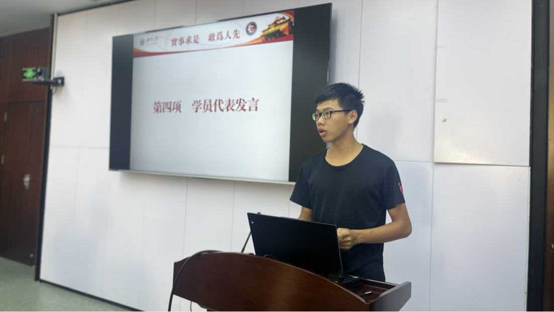 学生代表廖奕同学就参与本次培训班做出承诺,将认真学习理论知识,积极参与实践活动,并以身作则,继续深化学习党的理论,拥护党的决定,真正做到政治上坚定、思想上纯洁、行动上坚决,时刻保持对党的绝对忠诚。