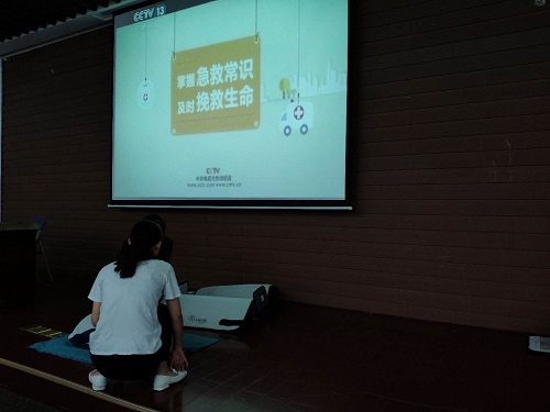本科生和研究生共同来见证和学习相关的急救知识。在讲座开始之前,主讲老师朱艳玲及其助手通过播放中央电视台急救知识短片让大家熟悉讲座主要内容,并及时摆好了实操所需的假人模型。