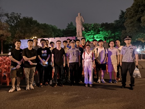 5月28日晚上9点,同学们准时集合,并各自在手机上的“星城园丁”APP上接单,接单的路线为桔子洲所路线。同学们在两位民警处领取巡逻肩灯后,巡逻正式开始。巡逻由两位民警和欧美女优