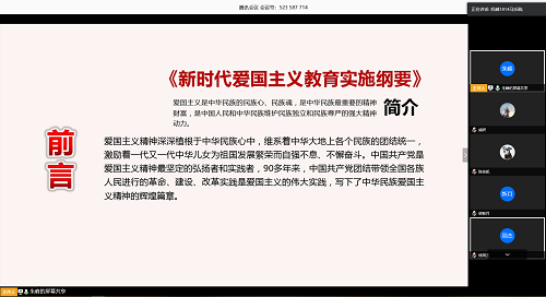 新冠肺炎防控指南》、肺炎防控知识手册,提醒同学们注意日常居家防护、及时疏导个人情绪。 朱峰、郑洲分享在疫情期间参与社区志愿者服务工作的经历与心得,班级助理肖启伟分享有关专业分流和保研的经验,鼓励同学们尽快确立更高目标,不断提高专业能力。同学们积极打开麦克风参与讨论。