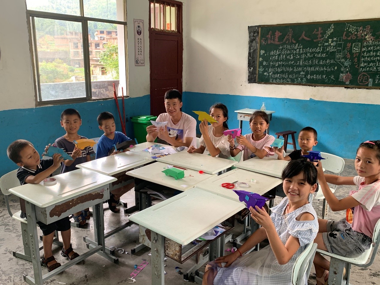 在手工课上,教室变成一座小小的手工艺作坊。志愿者纷纷化身“手工艺人”,教导小朋友们用纸制作汽车、飞机模型;一时间课堂活跃了起来,一辆辆“汽车”、一架架“飞机”横空出世。绘画课堂,在简单的介绍和指导后,志愿者向孩子们分发了画笔、颜料和特殊创作材料——孩子们用画笔在纯白色的笔袋、书袋和扇子上进行涂鸦。红黄橙绿青蓝紫,孩子们用一抹抹亮色描绘出心目中最具美感的场景——雨后初晴的彩虹,迎风飘扬的红旗,刺破浓雾的海上朝阳,浩浩汤汤奔腾不息的长江黄河。