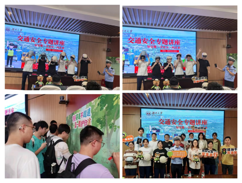 讲座接近尾声,同学们合影留念并在交通安全签名墙上郑重地签下自己的名字,许下遵守交通规则的庄严承诺。