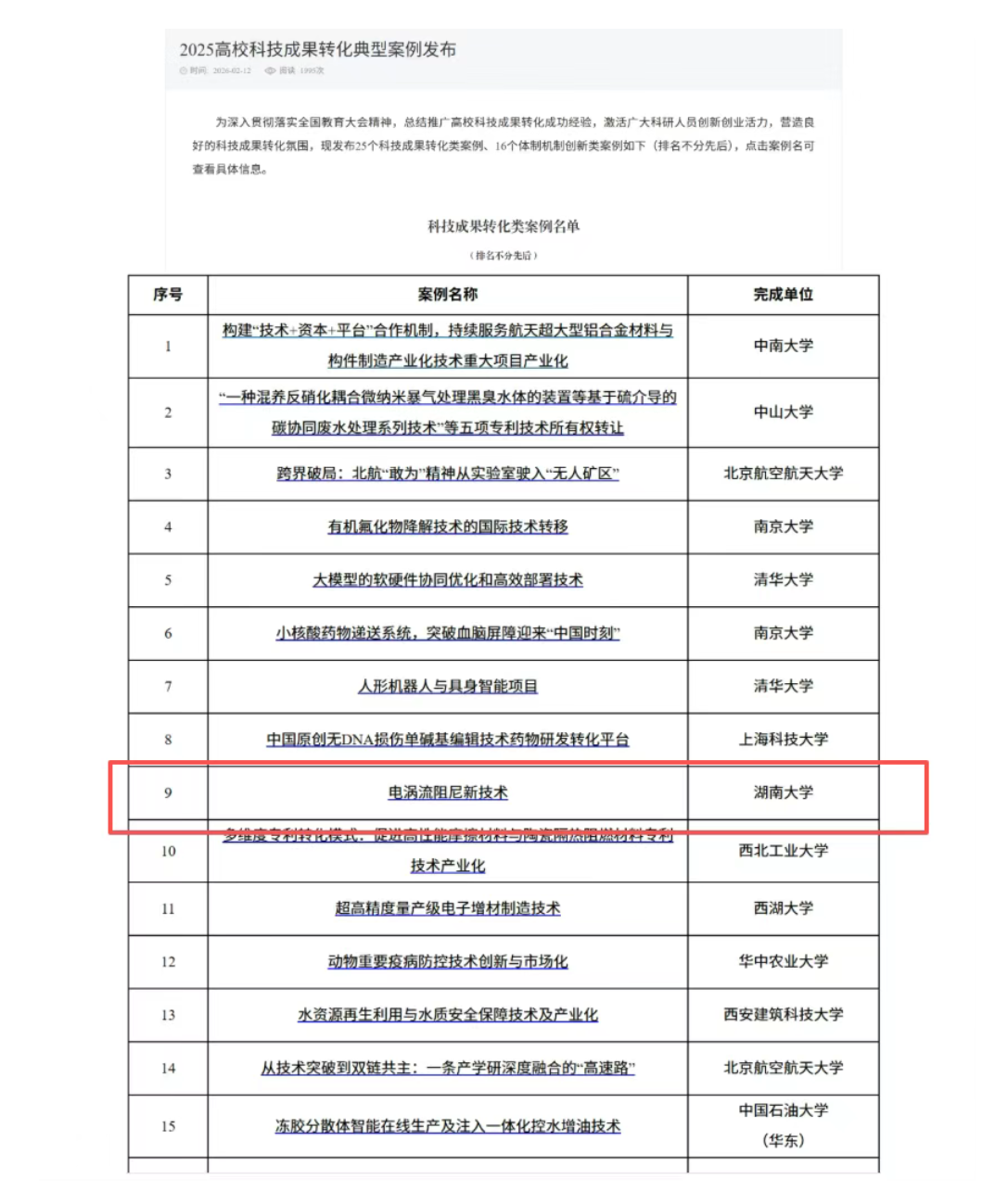 近日,为深入贯彻落实全国教育大会精神,总结推广高校科技成果转化成功经验,激活广大科研人员创新创业活力,营造良好的科技成果转化氛围,教育部高等学校科学研究发展中心发布25个科技成果转化类案例、16个体制机制创新类案例,我校陈政清院士团队“电涡流阻尼新技术”入选科技成果转化类案例。